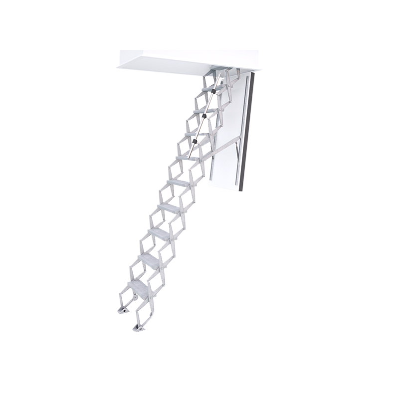 Unsere Scherentreppe mit patentierter Scherenmechanik aus Alu - Druckguss wird in einen brandschutzgeprüften Lukenkasten verbaut.